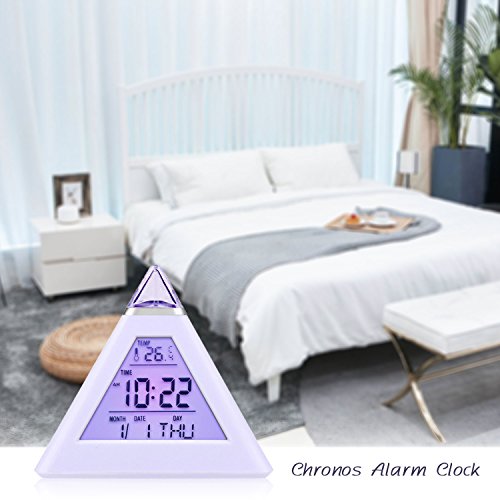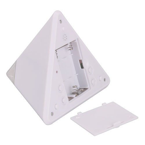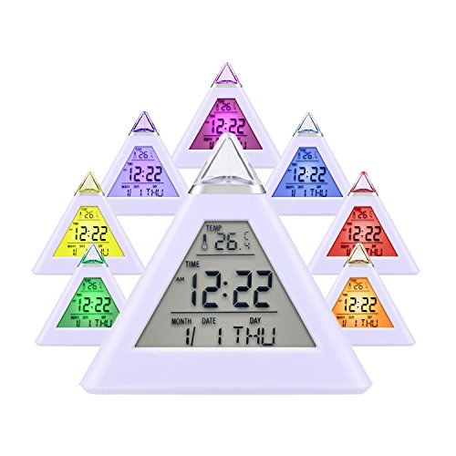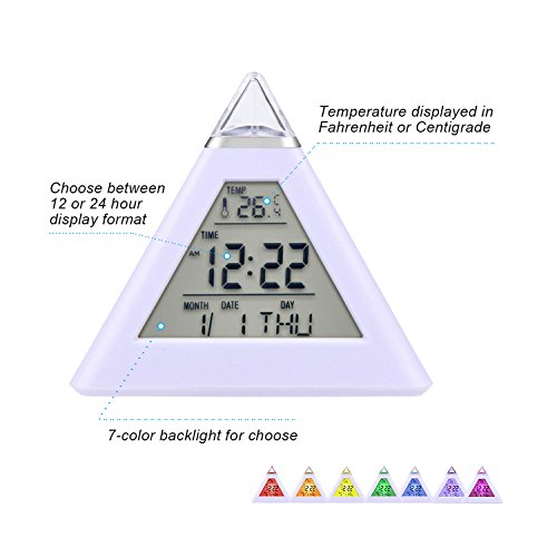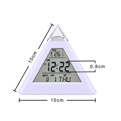 Studio : HAMSWAN Publisher : HAMSWAN Binding : Kitchen Product Description Feature ? Pyramid shaped 7 LED color changing alarm clock. ? Displays temperature time, date (from 2000 to 2099), day. ? 12/24 hours format and C/F conversion are alternative. ? Timing alarm. ? Can be placed in the car, office and home. Specification ? Type: Alarm clock ? Display type: Digital ? Shape: Triangle ? Light color: 7 colors ? Ringtone quantity: 8 ? Item color: White ? Material: ABS ? Battery: 3 * AAA batteries (Not included) ? Item size: 10.5 * 10.5 * 10.3 cm / 4.1 * 4.1 * 4.0 in ? Item weight: Approx. 62 g / 2.2 oz ? Package size: 8.5 * 8.5 * 8.5 cm / 3.3 * 3.3 * 3.3 in ? Package weight: 96 g / 3.4 oz ? Item size: 10.5 * 10.5 * 10.3 cm / 4.1 * 4.1 * 4.0 in Package includes: ? 1 x HAMSWAN Digital Alarm Clock ? 1 x User Manual