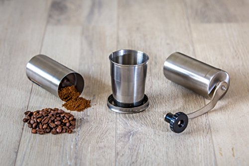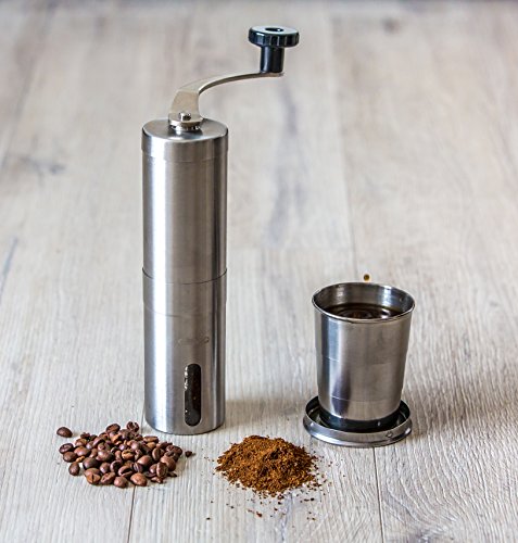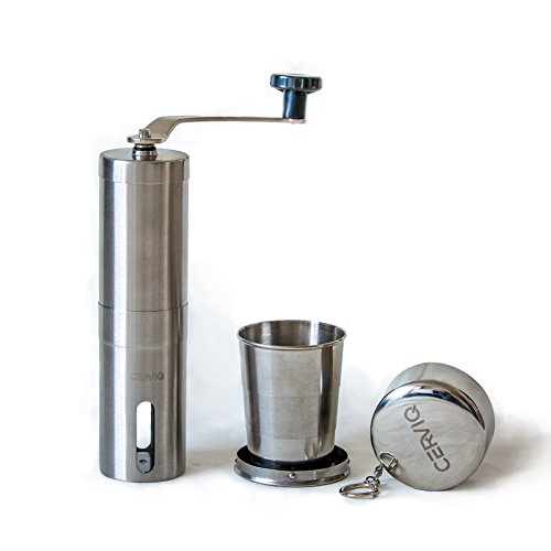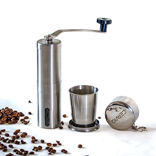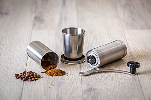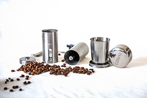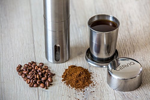 Superior Coffee Grinder Bundle for all the coffee enthusiasts that like to have the possibility to grind their own coffee beans; Includes foldable cup for when you’re on the move; The CERVIQ coffee grinder is made out of high quality stainless steel and has a ceramic bur that doesn’t rust like the metal ones