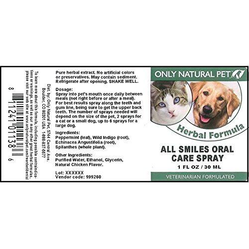 Studio : Only Natural Pet Publisher : Only Natural Pet Binding : Misc. Product Description Only Natural Pet All Smiles Oral Care Dental Spray Dog Cat Grooming, at Only Natural Pet Store, for oral health and clean teeth to remove plaque and tartar for fresh breath in cats and dogs. 0