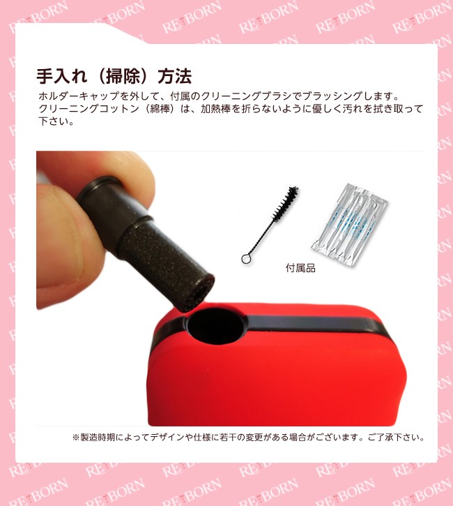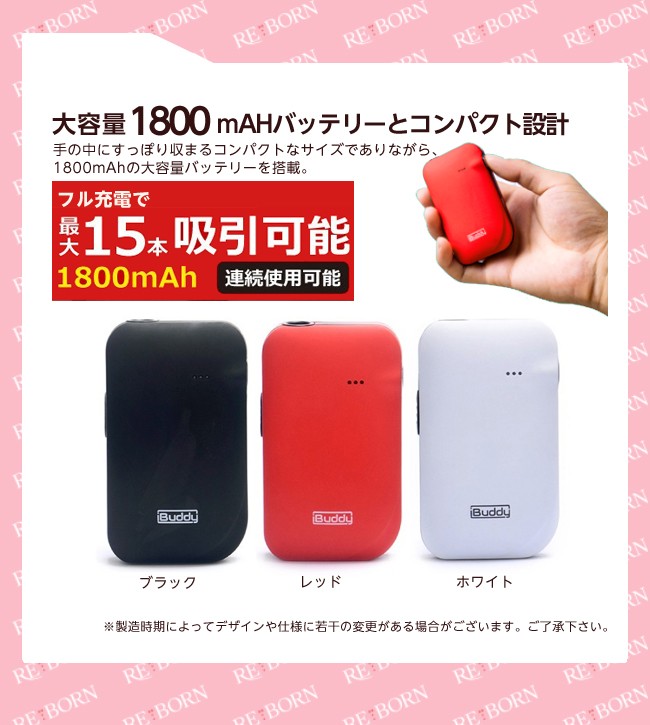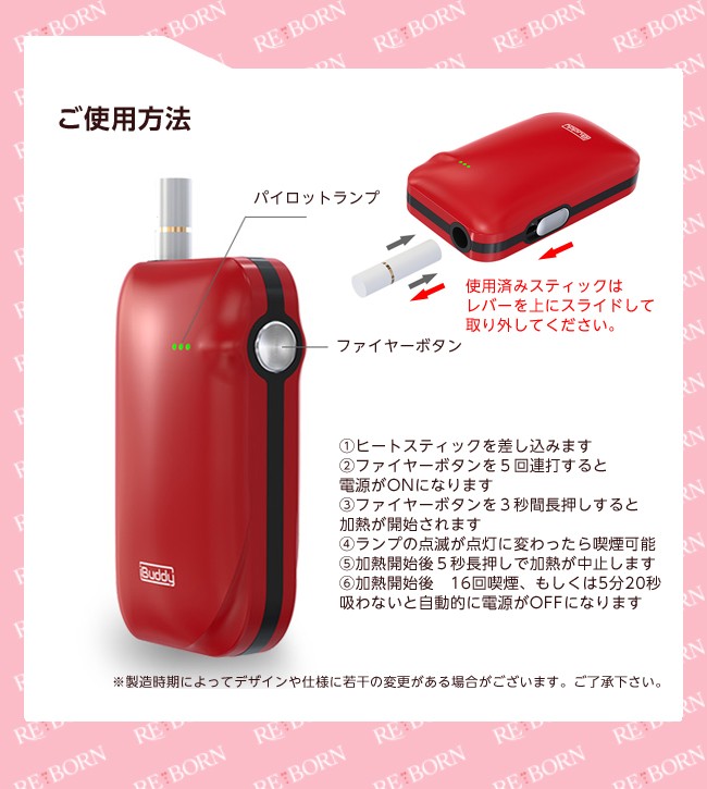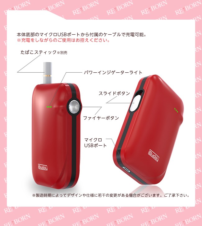 | 備考 | ◆ご購入の前に必ずご確認下さい。◆ ※連続吸引の際は3分程度空けてください。 連続吸引により熱が上がり過ぎてしまいますと自動制御スイッチ が ONになり電源が入らなくなることがあります。また、過度の連続吸引は故障の原因となります。 ※吸引本数などの記載情報数値関連はあくまで基本水準となり使用頻度や経年劣化等により変化する場合があります。 ※ 充電はパソコン等のUSB端子につないで充電してください。また1.1A以上のUSB-ACアダプタ・充電器は使用しないでください。 ※ 本体が熱い状態で吸い殻を出すのはやけどの危険がありますのでご注意ください。 ※ 製品は子供の手の届かないところに保管してください。 ※未成年者の喫煙は法律で禁止されています。 ※神経質な方・身体問題を気にされる方はご遠慮ください。 ※ヒート時間に関しては確実ではなくあくまで目安となります。 ※ご利用のモニターによって、実物と異なる色に表示される場合がございます。 ※製造時期によってデザインや仕様に若干の変更がある場合がございます。ご了承下さい。 |