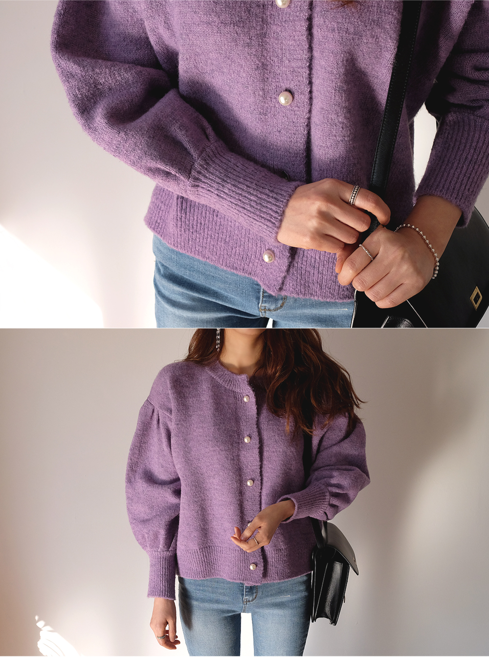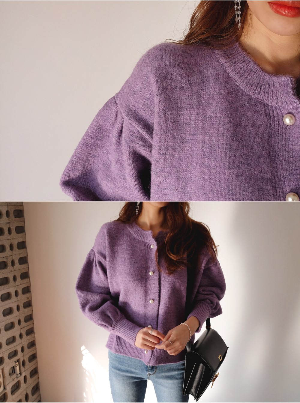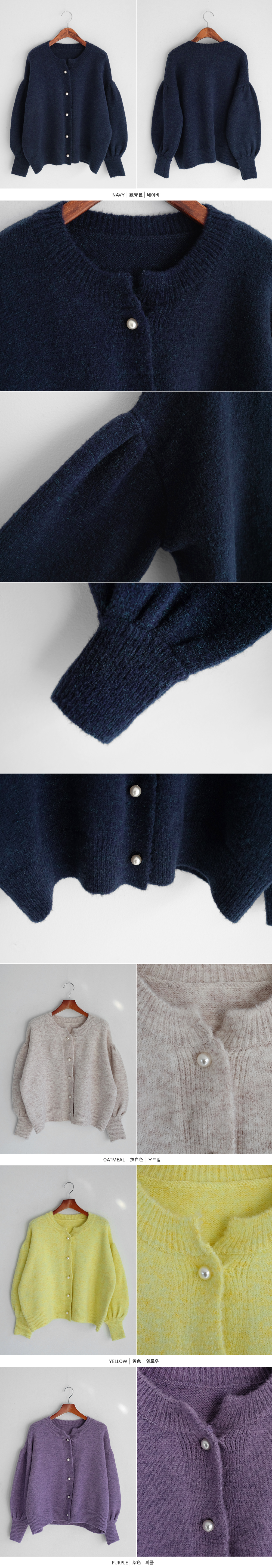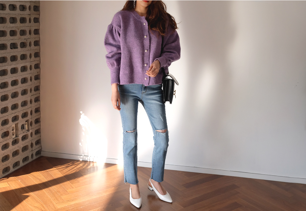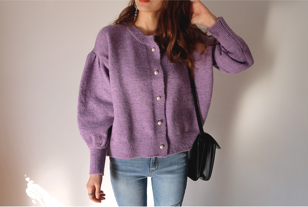 진주 버튼으로 고급스러운 분위기를 더해준 벌룬 가디건이에요:D