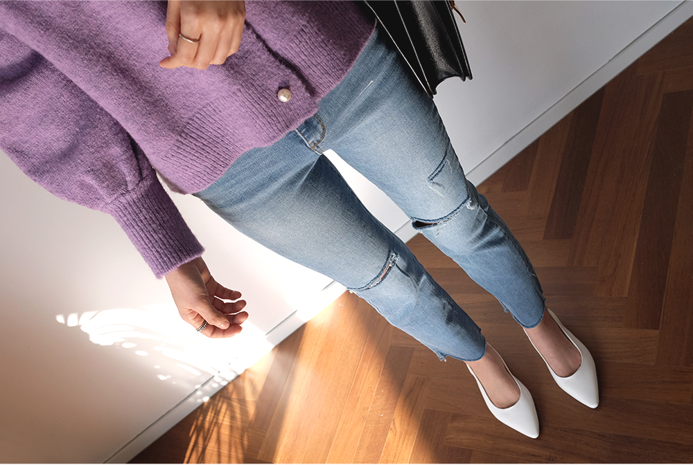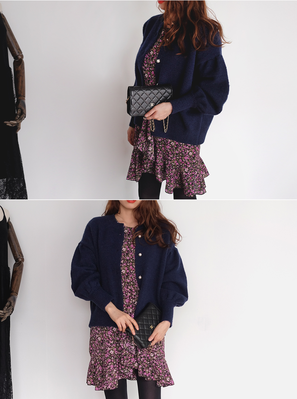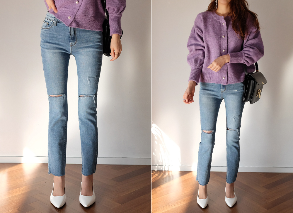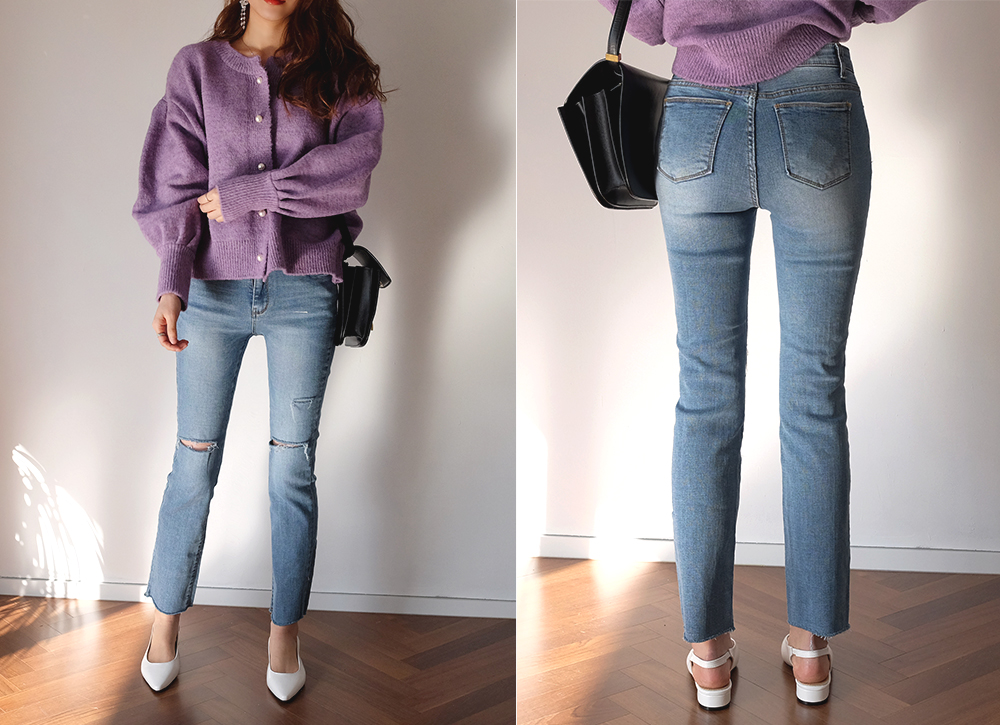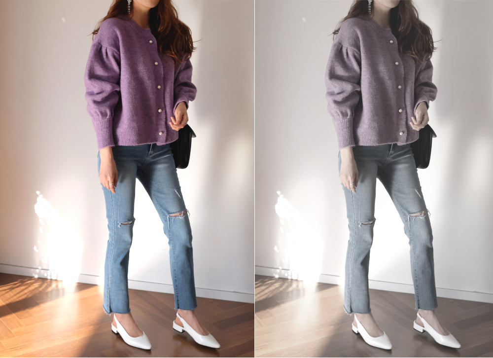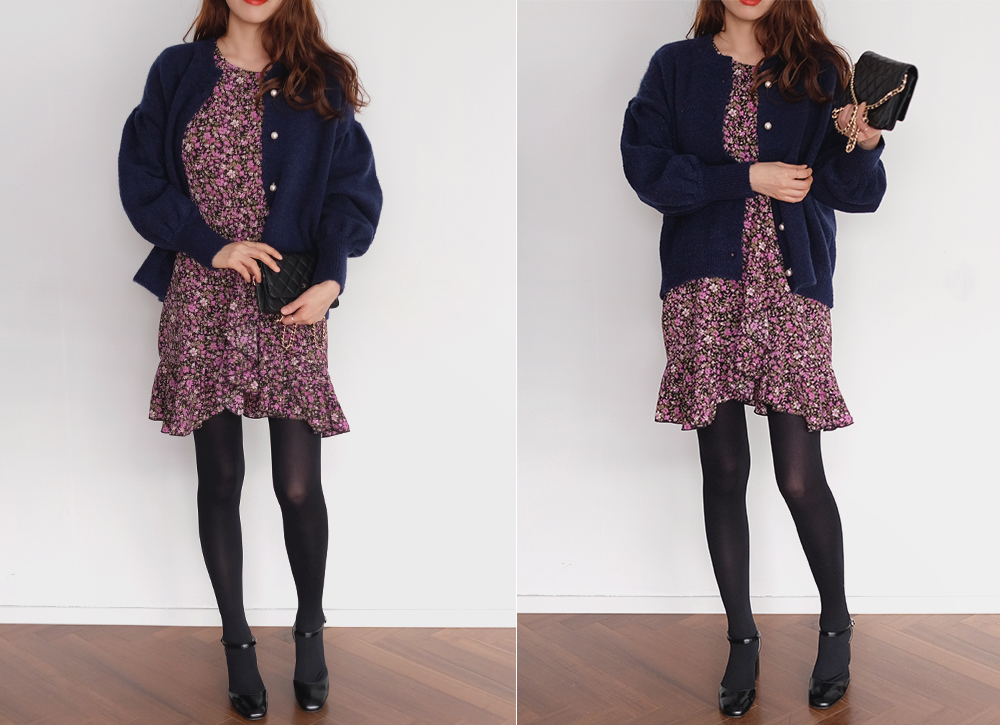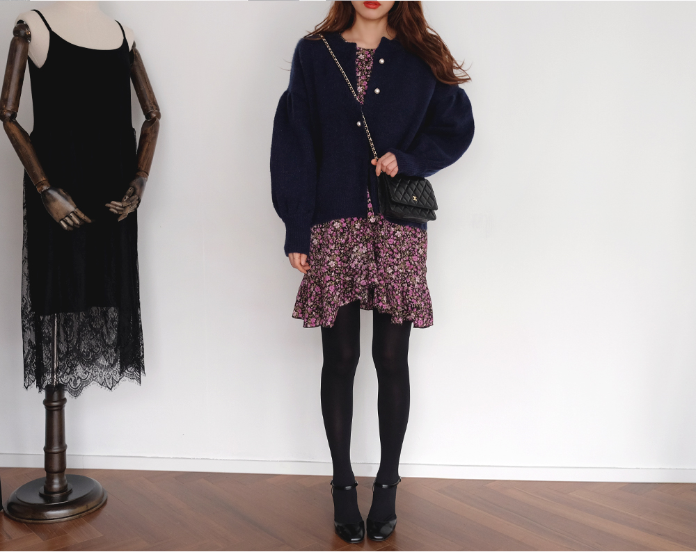 진주 버튼으로 고급스러운 분위기를 더해준 벌룬 가디건이에요:D