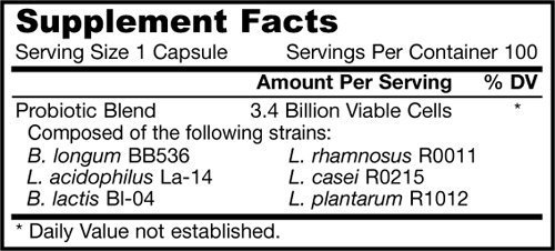 Suggested Use As a dietary supplement take 1 capsule up to 3 times per day during or shortly after a meal. For infants and children, open capsules and mix contents with water, unheated liquids such as fruit juices, or foods - Or as directed by your healthcare professional. Supplement FactsServing Size: 1 CapsuleServings Per Container: 100Amount Per Serving% Daily Value***Probiotic Blend3.4 Billion Viable Cells*Composed of the Following StrainsB.Longum BB536L.Acidophilus La 14B. Lactis BI-04L.Rhamnosus R0011L. Casei R0215L. Plantarum R1012 *Daily Value Not Established KEEP REFRIGERATED. ***Percent Daily Values are based on a 2,000 calorie diet