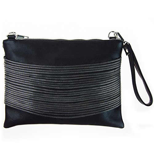 -. Brand : MG Collection -. Color : Black -. Department : womens -. Feature : Modern chic black clutch purse with cross-body adjustable strap with hanging silver zipper chains. / The interior features 2 pocket-style organizers and 1 zippered pouch. / The exterior has a unique chain zippers to add a punk rock flair to this classy black bag. / Detachable and adjustable shoulder strap and detachable wrist strap included. / Approximate Dimensions (in inches): Exterior - 8.5 H X 11.5 W X 1.0 D; Interior - 8.5 H X 11.5 W X 1.0 D; Shoulder Strap: 25 inch drop. -. Label : MyGift -. Manufacturer : MyGift -. Model : TB-H0715BLK -. MPN : TB-H0715BLK -. NumberOfItems : 1 -. PartNumber : TB-H0715BLK -. ProductGroup : Shoes -. ProductTypeName : HANDBAG -. Publisher : MyGift -. Studio : MyGift -. Title : Modern Chic Zipper Chain Decal Clutch Purse / Cross Body Shoulder Bag, Black