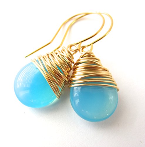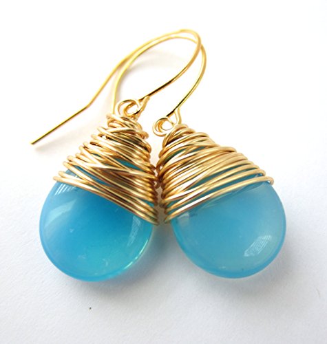 -. Title : Aqua Blue Wire Wrapped Earrings Gold Tone Wire