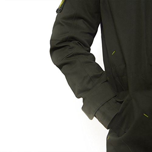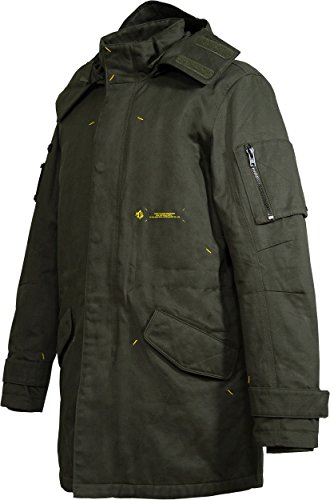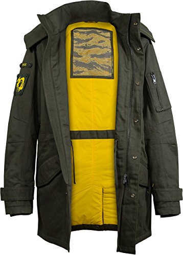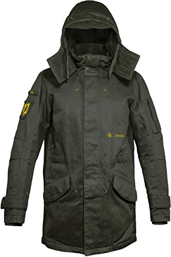 -. Binding : Apparel -. Brand : Musterbrand -. Color : Green -. Department : mens -. Feature : The durable cotton twill and the thick padding of the MGS Scout Jacket withstand most environmental influences / The attention to detail and the passion for quality can be clearly felt each time you put it on / Lots of pockets for all sorts of utilities. Two huge frontpockets, one small sleeve-pocket, two inside pockets / Detachable silicon FOX and XOF badges / Musterbrand is more than just merchandise. Highest quality - latest fashion - no compromise -. IsAdultProduct : 0 -. Label : Musterbrand -. Manufacturer : Musterbrand -. ProductGroup : Apparel -. ProductTypeName : OUTERWEAR -. Publisher : Musterbrand -. Studio : Musterbrand -. Title : Metal Gear Solid Scout Men's Long Winter Jacket Green by Musterbrand