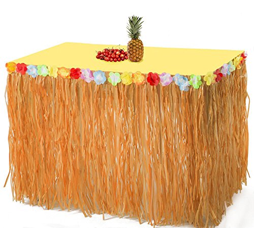 DRESS UP YOUR TABLE - Finish off your beach party decorations with this hibiscus natural colored table skirt. Spreads 9 ft out and hangs 29" inches low.
