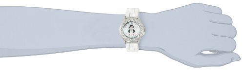 -. Feature : Silver-tone watch with Penguin graphic on dial, rhinestone-set bezel, and textured white rubber band / Quartz movement with analog display / Protective glass crystal dial window / Features buckle closure / Not water resistant