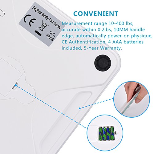 -. Feature : Body Fat Analyzer: Body function indexes including weight, BMI, BFR, muscle, moisture, bone mass, BMR, visceral fat, protein rate, body age, body Fat, weight without fat, muscle weight, the amount of protein and the degree of obesity etc. / Smart App: Bluetooth 4.0 technology,iOS & Android compatible,14 body function indexes, Data sync to Apple health, Facebook or Twitter. / Features: Unlimited number of users. Family health management and slimming plan setting. Regular reminders and infant model, Permanent health data. / No Set up Needed:1. Install and start the App 'AIFit',2. Turn on Bluetooth and APP ,3.Step on the scale to power on. the app will pair the Bluetooth scale automatically. / Convenient: Measurement range 10-400 lbs, accurate within 0.2lbs, 13*13*0.9 inch of size,3.5 inches Led display, Skid-resistant base and security design.CE Authentification, 4 AAA batteries included, 5-Year Warranty.