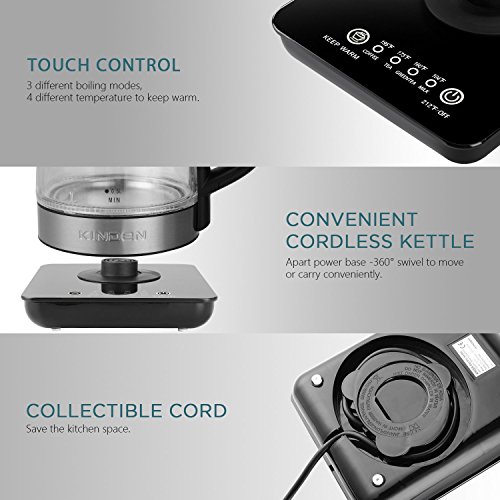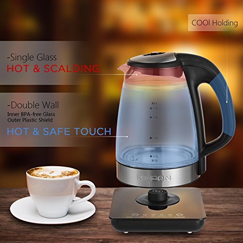 [Safe and high quality material] Plastic part is BPA free. The bottom part of kettle is 304 stainless steel. The touch panel of 360 degree swivel base is glass material. And the kettle body is pyrex glass, easy to clean and safe for your health.