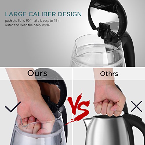 [Large capacity] This glass electric tea coffee kettle can boil water up to 1.7L, which means you can get enough boiled water to drink coffee, tea, milk or just hot water. It may need 7 minutes for boiling 1 kettle of water.