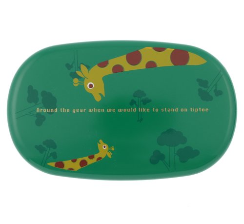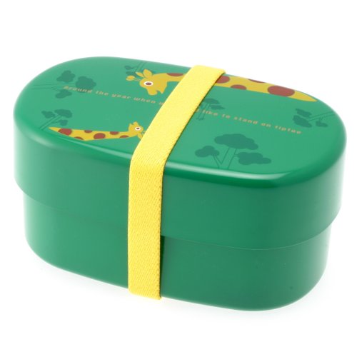 Kotobuki bento are Japanese style lunch boxes. The stacking two tiers keep foods and flavors separate and the top tier has a press on lid to prevent spills. Durable, attractive, and easy to clean. Microwave and dishwasher safe. Made in Japan. Green with giraffe. 6-inch L by 3-3/4-inch W by 3-inch H