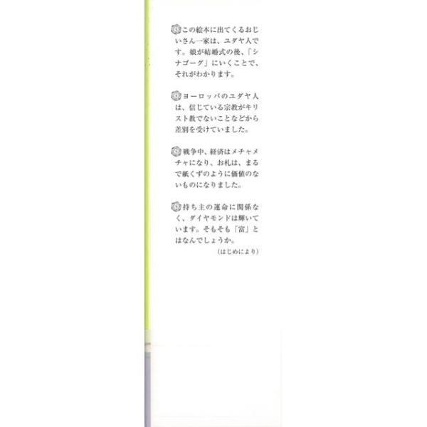 【商品説明】 定価(税込み):1,620円 値引き:10% OFF ユダヤ人であるおじいさんは、ある日ダイヤモンドを購入しました。しかし戦争が始まり、おじいさんは収容され戻らぬ人となり…。戦争も持ち主の運命も関係なく輝き続けるダイヤモンドから、「富」とはなにかを考える絵本。 バーゲンブック 新品 特価 格安 子ども ドリル 中学年向読み物 絵本 えほん 中学年 戦争 読み物 |