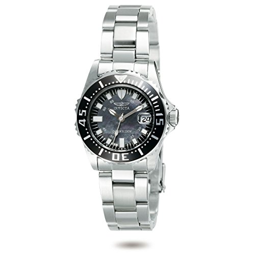 You can be a serious diver and still show a bit of style with the Invicta Abyss quartz women's stainless steel watch. Its round silver stainless steel watch case measures 30mm (1.35 inches) is topped by a black unidirectional rotating bezel with white elapsed time markings. The black mother of pearl dial features large luminous Tritnite dial markers and hands (with seconds hand), with encroaching minute indexes. The silver stainless steel link bracelet band is joined by a diver's buckle and safety clasp. Other features include a date function at 3 o'clock, anti-reflective mineral crystal, precise Swiss quartz movement, and water resistance to 200 meters (660 feet)--suitable for scuba diving.Tritnite is a luminous material with an extended glow exclusively developed by Invicta in Switzerland and added to their timepiece hands and markers. When exposed to regular daylight, it will hold its glow for about 20 hours.