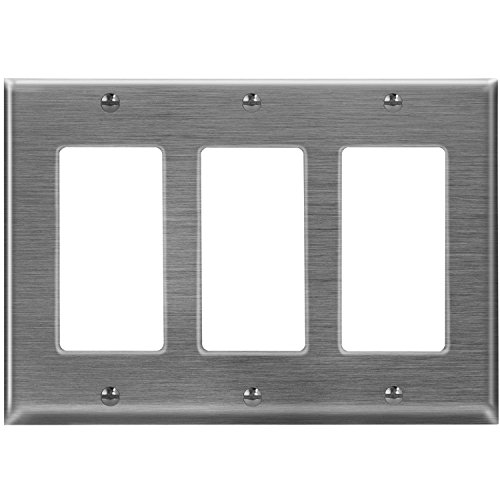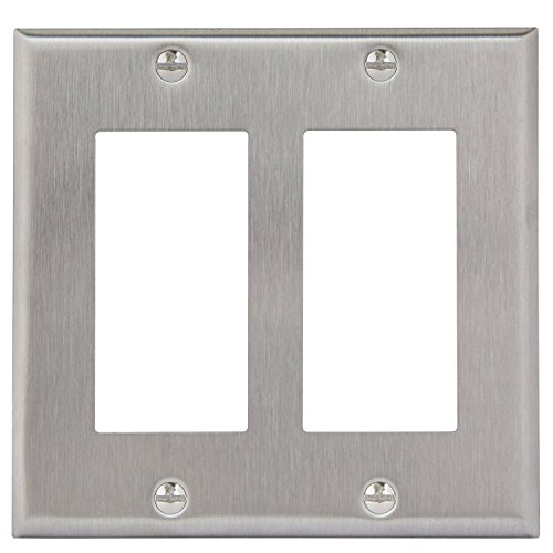 Specifications: Universal design allows easy retrofitting to any decorator/ rocker light switch or power outlet. Decorator stainless steel wall plate measures 2.76” Length x 4.50” Height x.25” Thick. Quality: Made of 430 stainless steel for any residential, commercial or industrial applications. Provides optimum durability, and resilience in abusive and corrosive environments. Features: Elegant smooth brushed finish and contoured edges enhance appearance while maintaining functionality. Curved and smooth edges protect from foreign objects while providing a safe cover. Applications: Perfect wall plate covering for residential home settings such as kitchens, and garages, or business environments such as restaurants, warehouses, hospitals, automotive repair shops. Installation: Easy DIY (Do-It-Yourself) with minimal tools required. Screw(s) included to match wall plate. Various size and styles available.Feature