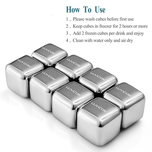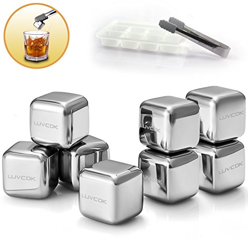 LUVCOK Stainless Steel Ice Cubes, Chilling Reusable Ice Cubes, Whiskey Stones, Cooling Rocks, with Nonslip Silicon Tongs and Tray, for Whiskey Vodka Wine Beer Soda and Any Beverage, Pack of 8 …