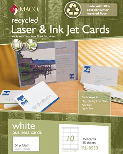 Studio : Chartpak Inc. Publisher : Chartpak Inc. Binding : Office Product Product Description Create high-impact with MACO Recycled Laser/Ink Jet White Business Cards. These business cards are made with 30% post-consumer fiber content and feature perforations for easy separation. Totally customize a blank canvas and print in both a laser or ink jet printer with guarantee not to jam. Easily customize by adding logo, graphics or text and print front and back sides; landscape or portrait orientation. Business card size: 2 x 3-1/2 inches. 10 per sheet; 250 cards per box. MACO has been providing quality products to the business community since 1916. Their office products truly offer a blank canvas for creative business solutions. 0