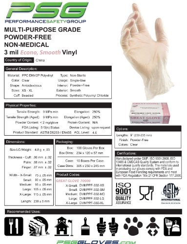 Studio : Performance Safety Group, Inc., us biss, PEVEA Publisher : Performance Safety Group, Inc., us biss, PEVEA Binding : Misc. Product Description Great Glove Vinyl Gloves are perfect for individuals allergic to natural rubber latex and ideal for all light-duty jobs and general food service use. Perfect for the price conscious consumer on a tight budget! Our PSG food service gloves are made from 100 percent PVC, a synthetic compound that is completely free of skin-irritating rubber proteins, which fully comply with FDA Rule 177.1950 for food contact and FDA Rule 110.10 GMP for food handling. These Powder-Free gloves leave no residue, reducing the risk of contamination compared to a powdered glove. Manufactured by the world’s largest rubber glove manufacturer ensures quality while meeting ASTM D5250, ISO 13485:2003, ISO 9001:2008 and FDA 21CFR 170-199 quality standards. ASTM D5250; Manufactured within the quality guidelines of ISO 13485:2003, ISO 9001:2008 and comply with FDA regulations for Food contact (21CFR, 170-199). Also available in our Premium PNM70000 or Powdered NM60000 Series. SAVE by ordering BY-THE-CASE to take advantage of our BEST PRICING! 0