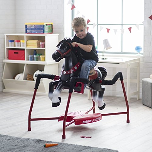 -. Binding : Toy -. Brand : Radio Flyer -. Color : Black -. EAN : 0042385111650 -. Feature : Dimensions: 36L x 21W x 41H in. / For ages 2 to 6 yrs. / Electronic sounds triggered by riding action / 3 stages of riding sounds: walking, trotting, and galloping / Includes brush and feeding carrot accessories -. IsAdultProduct : 0 -. Label : Radio Flyer -. Manufacturer : Radio Flyer -. MPN : 382X -. PackageQuantity : 1 -. PartNumber : 382X -. ProductGroup : Toy -. ProductTypeName : TOYS_AND_GAMES -. Publisher : Radio Flyer -. Studio : Radio Flyer -. Title : Radio Flyer Duke Interactive Riding Horse -. UPC : 042385111650