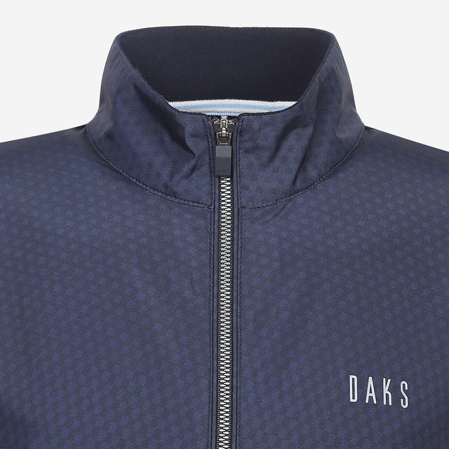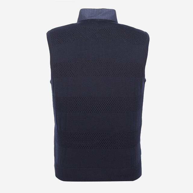 카라 부분과 앞쪽에 독특한 패턴이 있는 폴리소재를 배색하고 뒤쪽에 펀칭 장식을 더해 포인트를 준 베스트입니다.