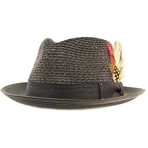 Men's Summer Cool Light Weight Removable Feather Soft Crushable Body Upturn Curled Brim Pleated Solid Black Ribbon Bow Hatband Retro Derby Fedora Trilby Cap Hat Spring Summer Light Weight Removable Feather Premium Soft Cruahable Body, Curled Upturn Brim Resort Wear Sun Hat with interior sweat band, no lining for cool comfort. Grosgrain striped pattern ribbon bow hatband. Redesigned for cool fit. Keep the harmful UV rays out of your face. Perfect for hot and warm weather outdoor activities, will keep you cool. Will compliment any outfit. How about for vacation or for resort wear. 0 |