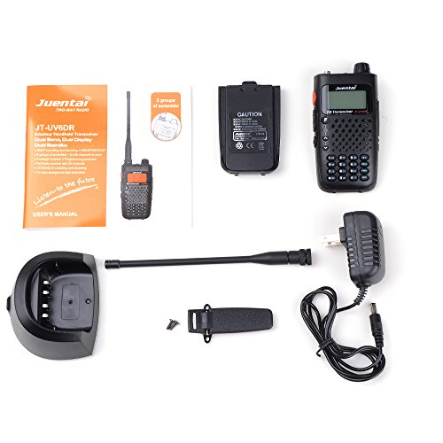 -. Binding : Electronics -. Brand : Juentai -. Color : Black -. EAN : 0751369405127 -. Feature : JUENTAI JT-UV6DR Newest Styles, Small Size, Good Frequency range(Up to 4 miles/7 km), Easy to Use,Durable and extremely Strong / Excellent dual frequency display with High Quality antenna / Good ergonomics overall, Decent desktop charger and 12-hour rechargeable battery life / Contrary to other radios, the new JT-UV6DR is perfectly capable of handling strong out-of-band signals. Use for: floorwalker, adventure sports, outdoor activities, retail and manufacturing industries others / It has multi-functions, such as dual band, dual display, dual watch, 128 Channels 50 CTCSS and 104 DCS and 8 groups scrambler and DTM Its performances are excellent, the shape is fashionable and 1-Year Warranty Included. -. Label : Juntai Electronics Co., Ltd -. Manufacturer : Juntai Electronics Co., Ltd -. Model : JT-UV6DR-1Pack -. MPN : JT-UV6DR-1Pack -. PackageQuantity : 1 -. PartNumber : JT-UV6DR-1Pack -. ProductGroup : Car Audio or Theater -. ProductTypeName : TWO_WAY_RADIO -. Publisher : Juntai Electronics Co., Ltd -. Studio : Juntai Electronics Co., Ltd -. Title : JUENTAI JT-UV6DR Dual-band Two way radio 136-174/400-480 Mhz Fm Radio 75-105mhz 8 Groups of Scrambler Dtmf&remote Kill/stun Function Ham Two Way Radios Amateur Radio (Black, Set of 1) -. UPC : 751369405127