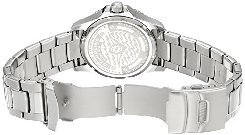 Stainless steel round shaped case with red unidirectional ratcheting bezel and screw down crown Protective Krysterna crystal on front and decorated case back Water-resistant to 200 M (660 feet) Stainless steel triple row link bracelet Black matte finish dial with applied Luminous filled Arabic numerals and markers