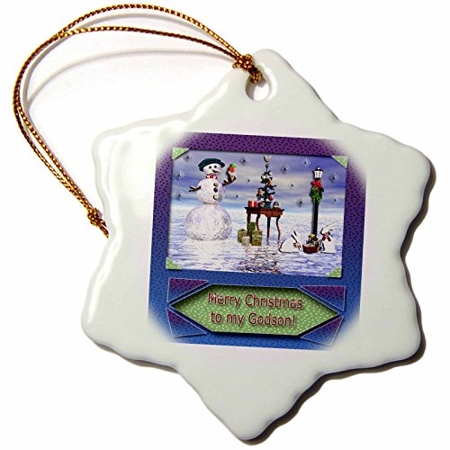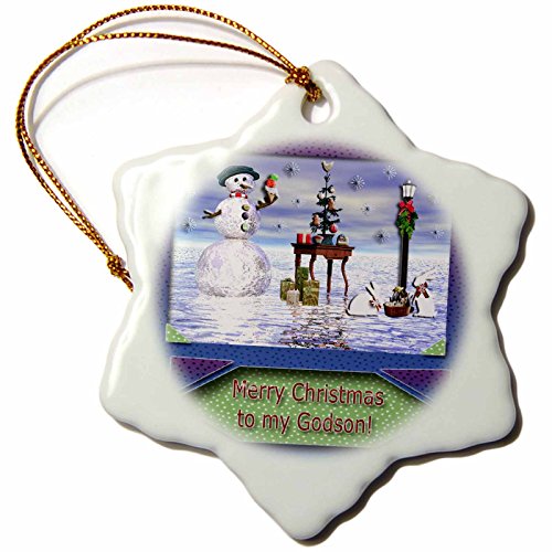 3dRose Snowman with Bunny Friends 3D Merry Christmas to Godson Snowflake Porcelain Ornament, 3-Inch