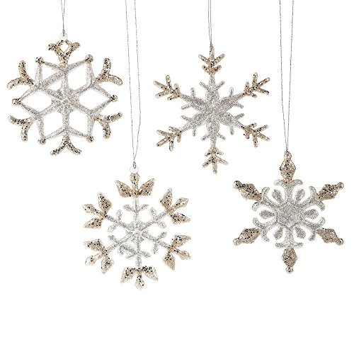- Includes 4 Assorted Designed Glitter White & Silver Snowflake Ornaments with Silver Hanging String