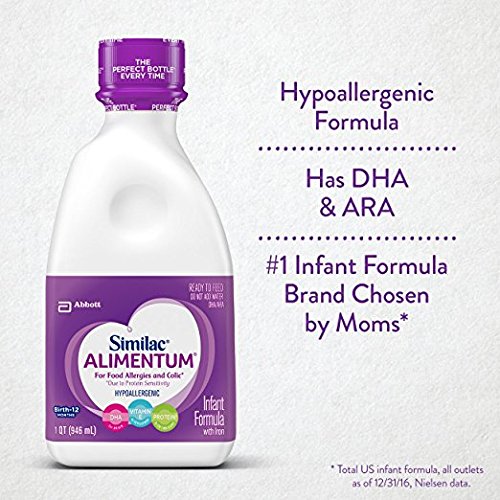 -. Binding : Misc. -. EAN : 0749531756849 -. Feature : 2 - 32 ounce/1 quart bottles included. / Lactose-free carbohydrate for lactose sensitivity / Hypoallergenic and contains a milk protein that is broken down in to tiny pieces to virtually eliminate allergic reactions in most babies who are allergic to cow's milk protein. / Each container has 32 oz of Ready to Feed formula. 2 containers included / Just twist off the cap, no powder mixing or measuring and the formula is ready for your baby -. IsAdultProduct : 0 -. Label : Abbott Similac -. Manufacturer : Abbott Similac -. PackageQuantity : 2 -. ProductGroup : Grocery -. ProductTypeName : GROCERY -. Publisher : Abbott Similac -. Studio : Abbott Similac -. Title : 2 quarts - Similac Alimentum Ready to Feed - Hypoallergenic Formula with Iron -. UPC : 749531756849