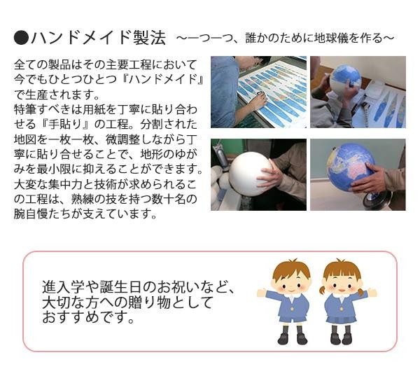 | 球径26cmの行政図(国や地域別に色分け)タイプの地球儀です。ホルダー、台座に品のあるピアノブラックを使用しました。大きめ文字の採用や低反射仕上げなど、読みやすさにもこだわっています。日本地図、国旗付世界地図付き。 |