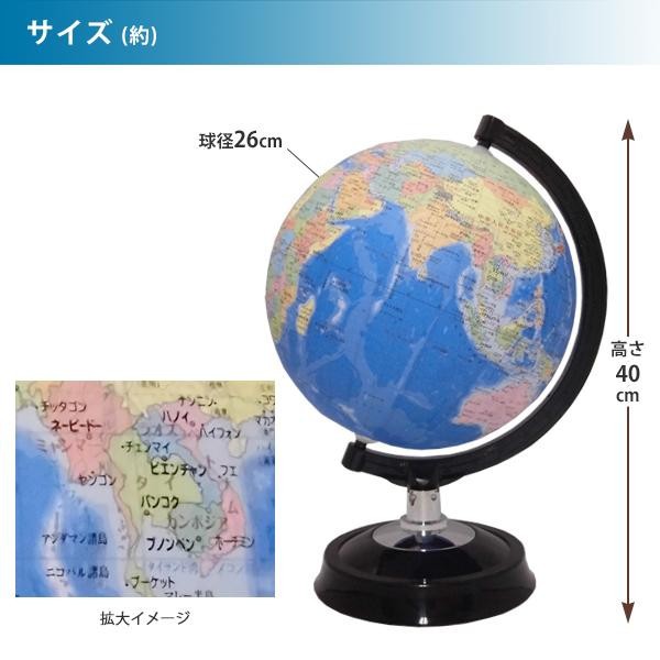 球径26cmの行政図(国や地域別に色分け)タイプの地球儀です。ホルダー、台座に品のあるピアノブラックを使用しました。大きめ文字の採用や低反射仕上げなど、読みやすさにもこだわっています。日本地図、国旗付世界地図付き。 |