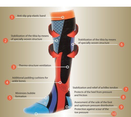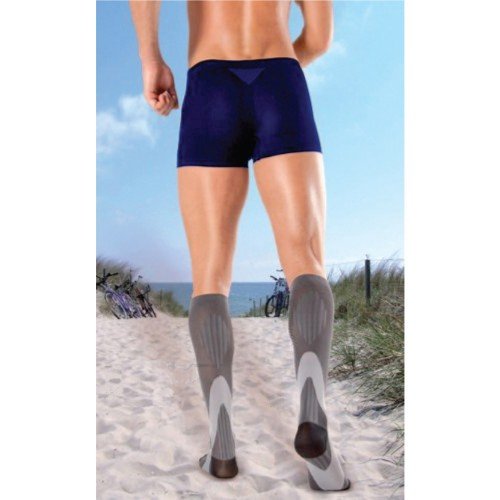legs with sporty, ribbed Travel Support Socks that provide 8-15 mm Hg of