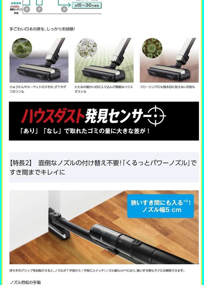 ●「ハウスダスト発見センサー」で目に見えない約20μmの微細なゴミまで見つけてお知らせ!ゴミの多いところでは、吸引力がアップ1!ゴミが少ないところでは、パワーを抑えて1電力のムダを省きます。