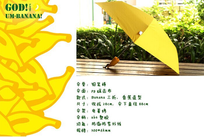 Payung Pisang didesign unik terutama untuk anak-anak karena sangat mirip dengan pisang pada umumnya, membuat payung ini terlihat menarik. Keunggulan lain dari Creative Banana Umbrella ini tidak terlihat seperti payung ketika dilipat.