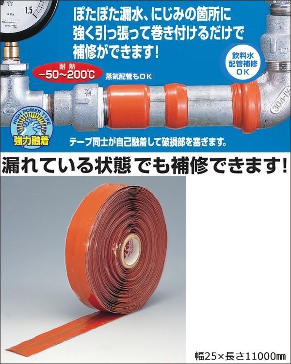 強く引っ張りながら巻き付けると、テープ同士が自己融着し、配管やホースの漏れ、にじみ、ピンホールなどの破損部や隙間に密着。圧力が掛かった状態でも簡単に補修できるテープです。ほとんどのパイプやホースの補修に使え、絶縁テープとしてもご使用いただけます。 |
