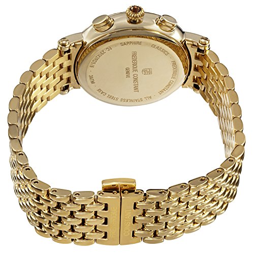 Chronograph function features a sweep seconds hand and a 30 minute counter at the 12 o'clock position, Gradue Pour 30 Pulsations scale displayed around the flange provides the pulse rate after counting 30 heartbeats.Scratch resistant sapphire crystal, Swiss quartz movement, Caliber FC-291, Water resistant to 3 ATM/30 meters/99 feet.Polished yellow gold plated stainless steel bracelet, Push button deployment clasp