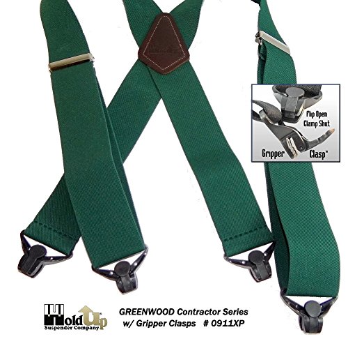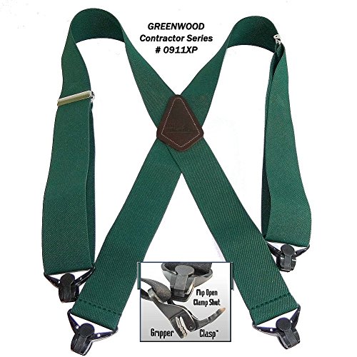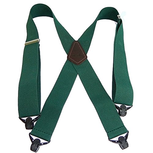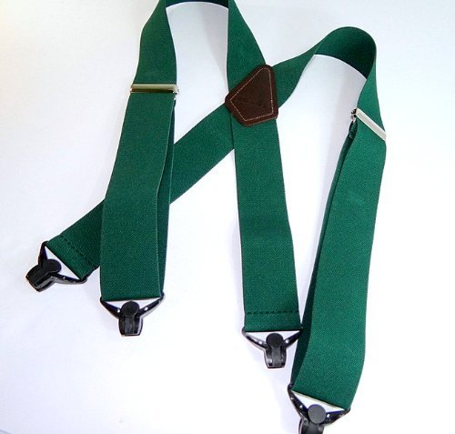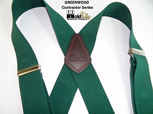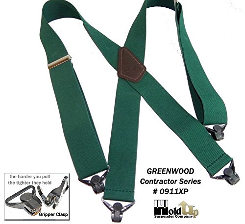 Binding : Apparel Product Description These DARK Greenwood GREEN colored 2" wide 48" long Jumbo Contractor Series suspenders are specifically designed for securely holding up a working man's pants. With everything imaginable hanging from your trousers it's hard to keep them up with just a ordinary belt. The contractor suspender is specially designed with wider straps and our Patented clip to assure you're Always Up with maximum comfort. These make perfect gifts for that hard working man who knows the limitations of conventional suspenders. This style has 4 Composite plastic Patented Gripper clasps for extra holding power. The patented plastic gripper clasps are cam activated which means the harder you pull on them the tighter they grip. All materials are carefully chosen for elastic durability, good looks and are guaranteed to never slip, slide, or fly off. Buy one of these dark Greenwood Green color Contractor suspenders with Plastic Gripper Clasps clips here on Amazon. Holdup Suspender Company sells more suspenders then any other USA manufacturer. These have a unique, patented Holdup® JUMBO black composite Plastic Gripper Clasp with top grade natural leather crosspatch. Available in X-back only with brown leather crosspatch. These 2x4 Contractor series Holdup® work suspenders have 4 US Patented Jumbo GRIPPER CLASPS that hold tighter the harder you pull on them. Great for wearing with work jeans and our Holdup® logo is etched into the Top Quality leather double strength crosspatch. Great for those seeking the best in a rugged working mans suspender. Works great for extra large men,construction workers and hikers love wearing these too! 0