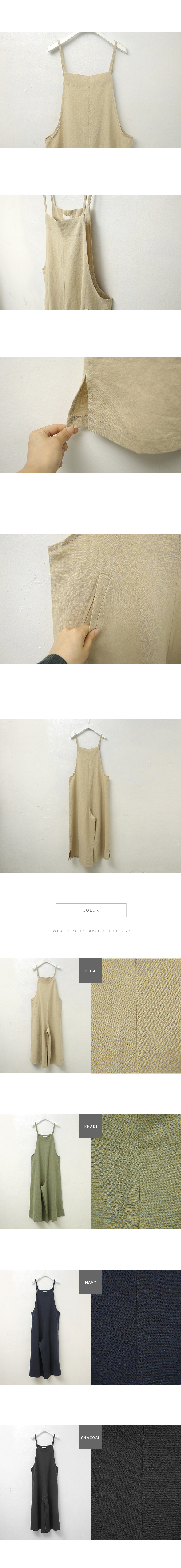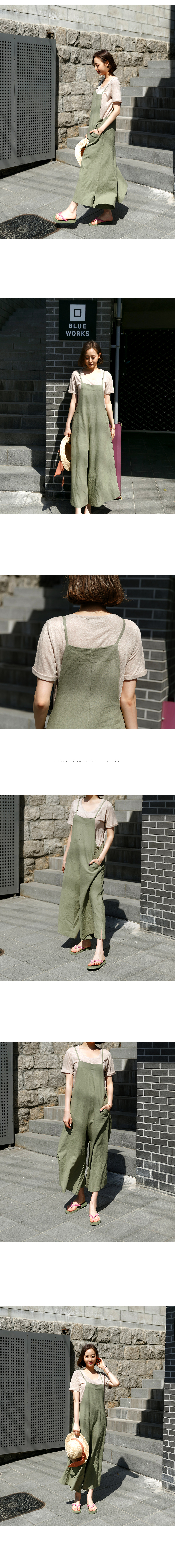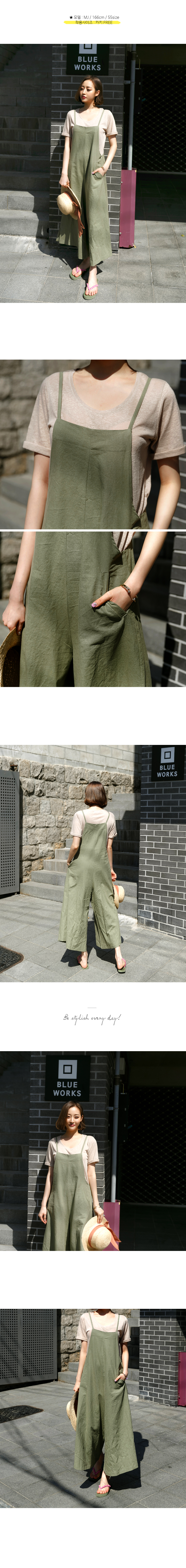 강력추천! 날씬핏 에이라인 점프수트뷔스티에 스타일의 얇은 어깨끈 아래로슬림하게 골반까지 디자인되어 있어상체가 날씬해보이구요골반선에서 A라인으로와이드하게 떨어지는 바지 라인으로통이 넓어 편안하고 멋스럽고날씬하고 여성스러움이 있어요린넨 ,코튼 혼방으로 네추럴함은 살리고너무 가볍지 않게 툭 떨어져 라인이 예쁘답니다색상은 베이지, 카키, 챠콜, 네이비사이즈는 FREE 55~66반까지 가능하답니다