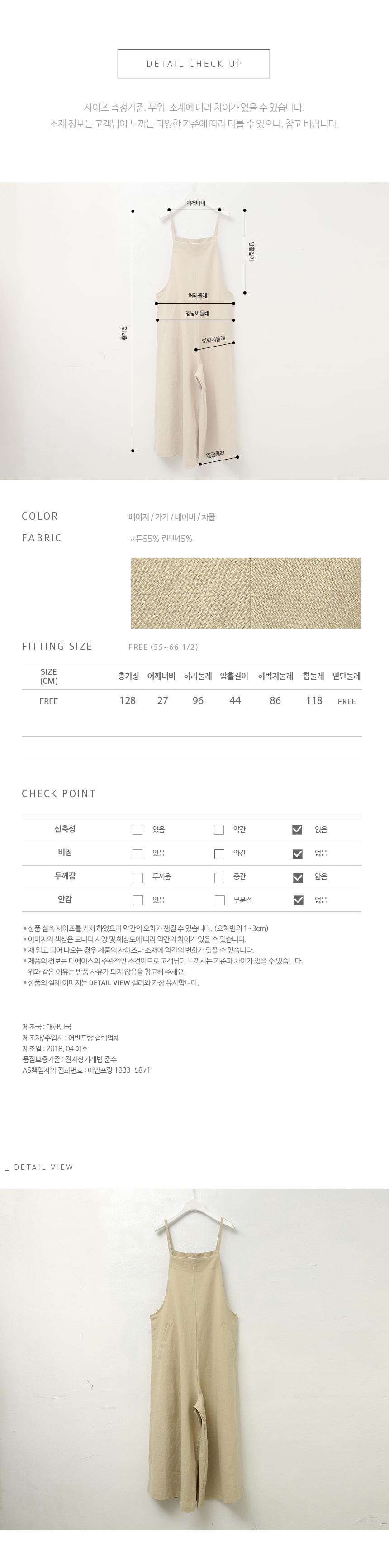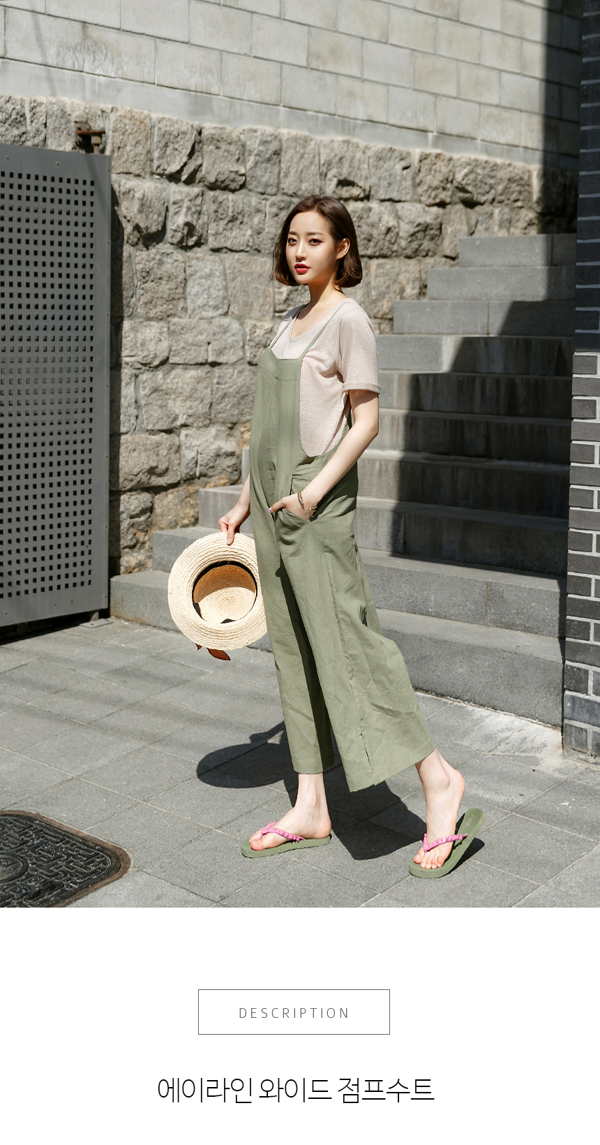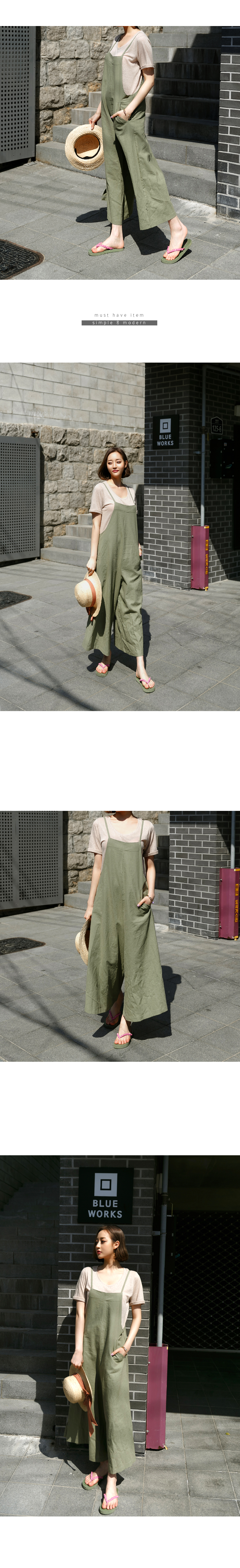 강력추천! 날씬핏 에이라인 점프수트뷔스티에 스타일의 얇은 어깨끈 아래로슬림하게 골반까지 디자인되어 있어상체가 날씬해보이구요골반선에서 A라인으로와이드하게 떨어지는 바지 라인으로통이 넓어 편안하고 멋스럽고날씬하고 여성스러움이 있어요린넨 ,코튼 혼방으로 네추럴함은 살리고너무 가볍지 않게 툭 떨어져 라인이 예쁘답니다색상은 베이지, 카키, 챠콜, 네이비사이즈는 FREE 55~66반까지 가능하답니다