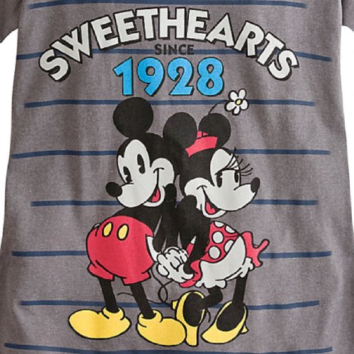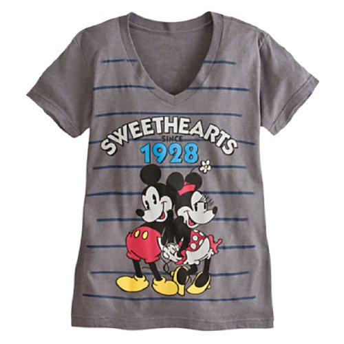 from the manufacturer: Classic Mickey and Minnie celebrate their status as ''sweethearts since 1928'' on this heathered v-neck tee, perfect for fun times with your own special someone!