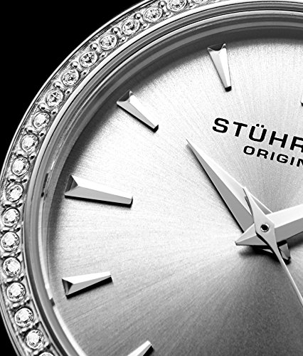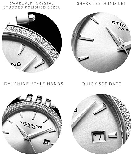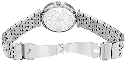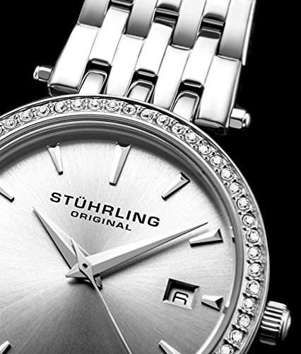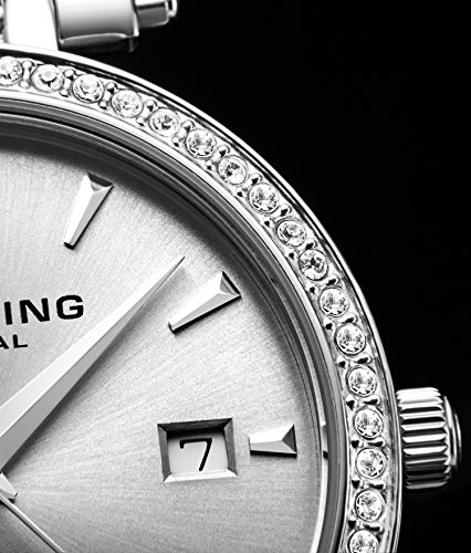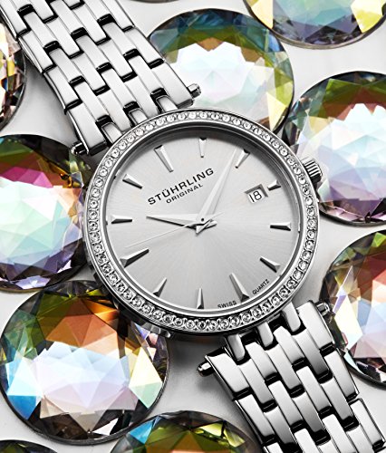 Polished stainless steel round shaped case with Swarovski crystal studded bezel Protective Krysterna crystal on front and decorated case back Silver brushed finish dial with stainless steel applied markers and date window Stainless steel seven row link bracelet with push button clasp Water-resistant to 50 M (165 feet)