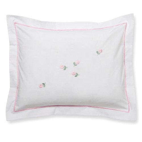 Baby boudoir pillow embroidered with scattered pink rosebuds. Machine wash cold.