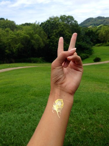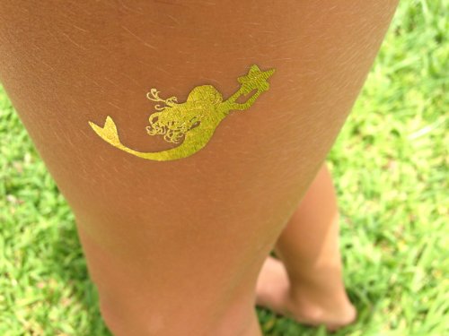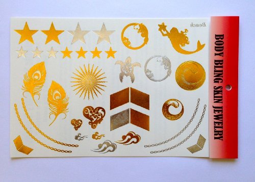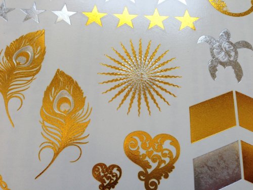 - Feature : Temporary tattoos made with silver and gold foil. / Goes on like a temporary tattoo, looks like jewelry. / Includes 31 individual tattoos plus 4 chain designs for necklaces. / Goes on in 30 seconds, comes off just as easily. / Sheet measures approx. 6" x 8".