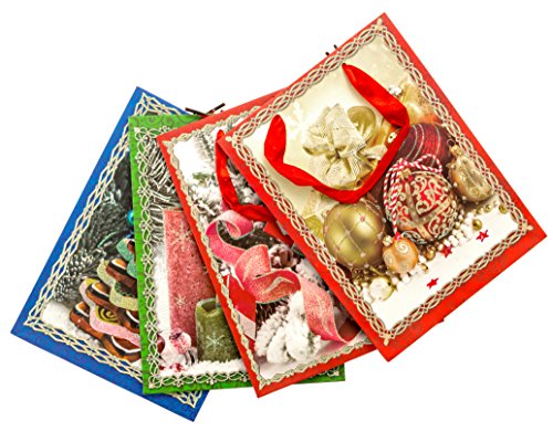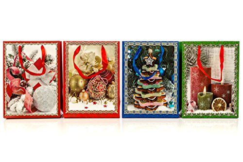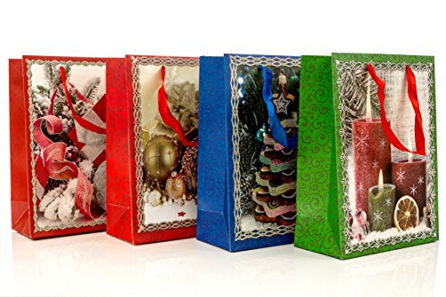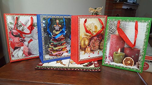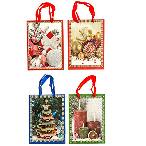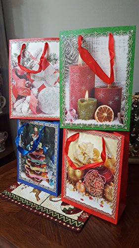 Christmas Gift Bags, Set of 4, Four New Designs, Ribbon Handles, Glitter Accent, 7 in x 9 in x 4 in