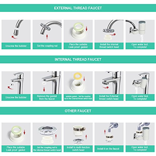 Package Include: 1*Host 1*Filter element (inside the host) 1*Universal joints 6* Different sizes of internal and external thread faucet accessories 1*Manual 1*Sandpaper 1*Tighten the key 1*Certificate 4*Faucet accessories ring (3 separate placement, one in multi-purpose connector)