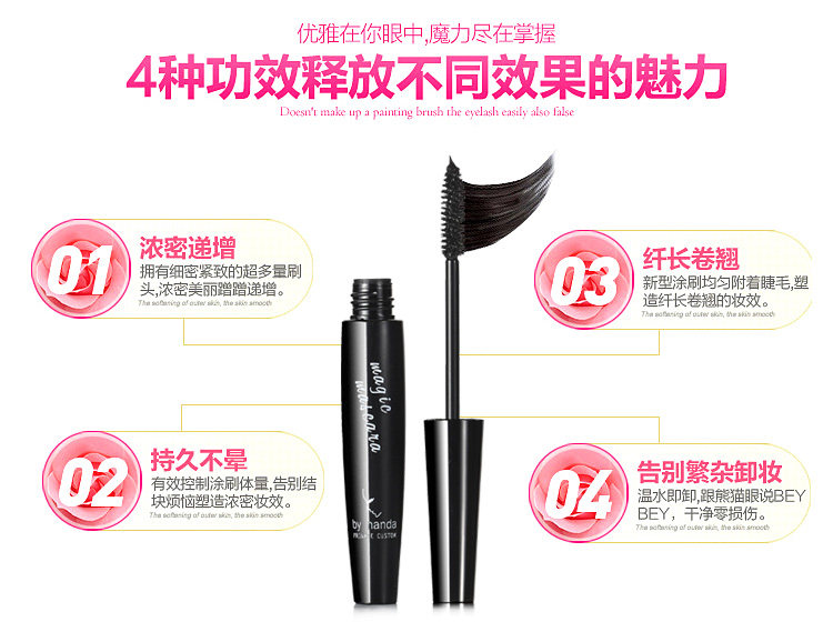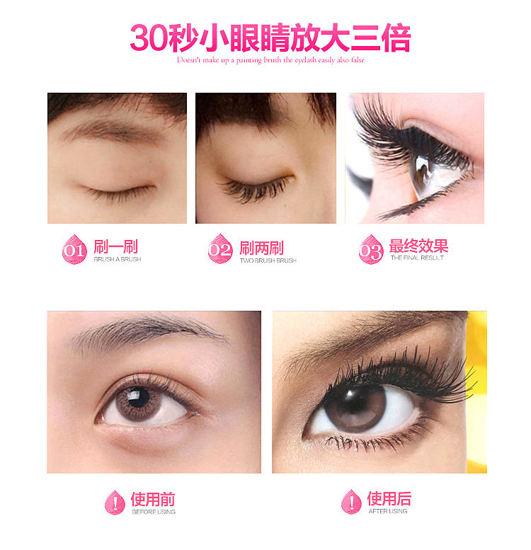 温馨提示:睫毛膏使用不当,会让空气跑入瓶中,使睫毛膏氧化变干,不容易涂抹哦。