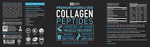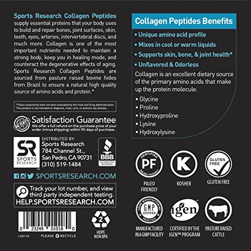 -. Binding : Health and Beauty -. Brand : Sports Research -. EAN : 0023249010180 -. Feature : COLLAGEN PEPTIDES: Collagen is one of the most important nutrients needed to maintain strong bones, healthy joints, and counter act the degenerative effects of aging.* **PRODUCT PACKAGING MAY VARY*** / PREMIUM: Made from 100% Pure Hydrolyzed Gelatin sourced from pasture raised Cowsl. SR® Collagen is enzymatically processed several times to leave its peptides intact, resulting in a neutral tasting, highly available protein.* / BENEFITS: As a concentrated source of Amino Acids, Collagen nourishes the tissues throughout the body, such as cartilage, bones, tendons, ligaments, muscles, vital organs, skin, hair, and nails.* / ODORLESS & TASTELESS: Collagen Peptides is a highly available protein that is odorless, tasteless and easy to mix in protein shakes, coffee or tea. / BULLETPROOF YOUR COFFEE: Mix Collagen with our MCT oil made from Organic Coconuts for a delicious morning pick me up. ***PRODUCT PACKAGING MAY VARY*** -. Label : Sports Research -. LegalDisclaimer : *These statements have not been evaluated by the Food and Drug Administration. This product is not intended to diagnose, treat, cure or prevent any disease. -. Manufacturer : Sports Research -. MPN : SR_CP -. PackageQuantity : 1 -. PartNumber : SR_CP -. ProductGroup : Health and Beauty -. ProductTypeName : HEALTH_PERSONAL_CARE -. Publisher : Sports Research -. Studio : Sports Research -. Title : Premium Collagen Peptides (16oz) | Non-GMO Hydrolyzed Gelatin Protein Powder - Unflavored, Odorless and Easy to Mix -. UPC : 023249010180