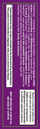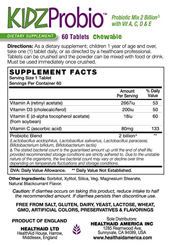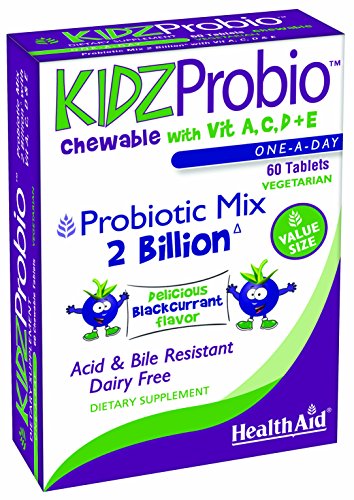 KidzProbio Chewable is a unique formulation containing special viable strains of Lactobacillus and Bifidobacterium designed with your child's well being in mind. Together with the added benefits of Vitamin A, C, D and E; KidzProbio helps keep the digestive system in balance*. HealthAid uses special bile resistant starins, which prevent the stomach juices destroying the ingredients before the reach the intestines, ensuring their purity and potency*.