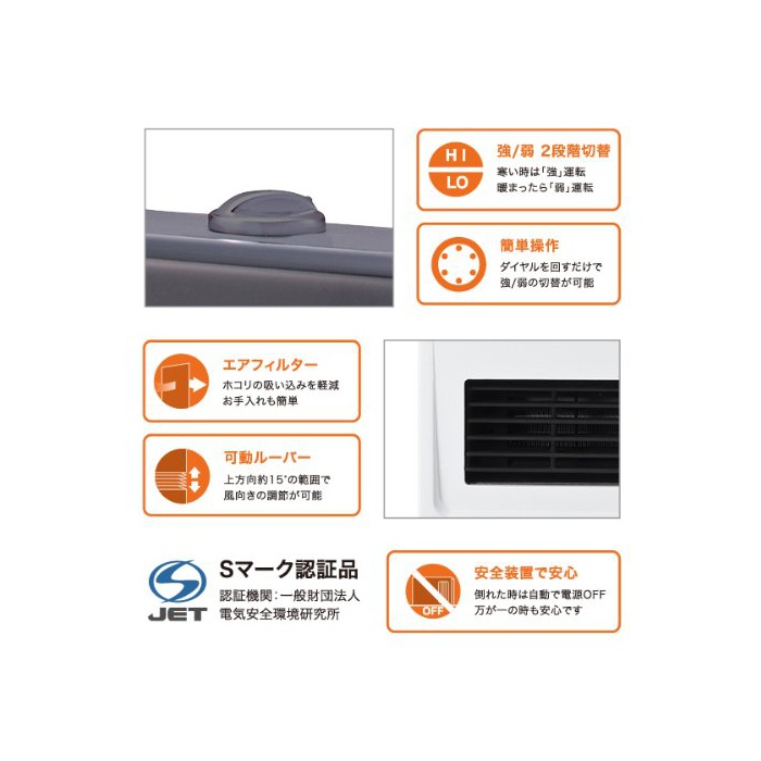 자동으로 스위치 온!화장실이나 키친,탈의장 등에서 냉방병을 예방.자동으로 스위치 오프가 되기 때문에 스위치 자르는 줄 모르는 것이 없기 때문에 안심입니다.상품 명인감 센서부 세라믹 팬 히터 사이즈 폭26.7×(길이)깊이12.4×높이38.4cm 재질 PP 중량 2.8kg 코드 길이 1.5m 전원 AC100V 50/60Hz 소비전력 HI/1000W,LO/500W 운전 모드 인감센서(자동 운전)고, 연속 운전,HI/LO(2단계 교환) 센서 감지 범위 좌우60°고, 상하60° 센서 도달 범위 2m 안전장치 온도 퓨즈,thermostat,전도 시 자동OFF스위치 1시간당의 전기요금(기준) 약27엔(강1000W사용 시) 보증기간 1년간